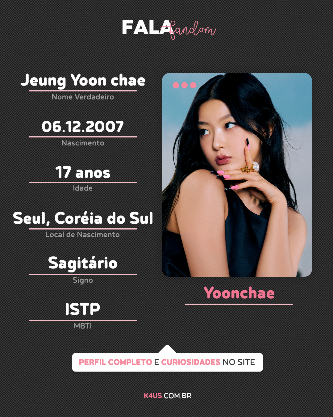 - Yoonchae é amiga da Eunchae, do LE SSERAFIM. Foi a Sophia quem ajudou a aproximá-las, pedindo o número da Eunchae para a Huh Yunjin, com o objetivo de torná-las amigas.